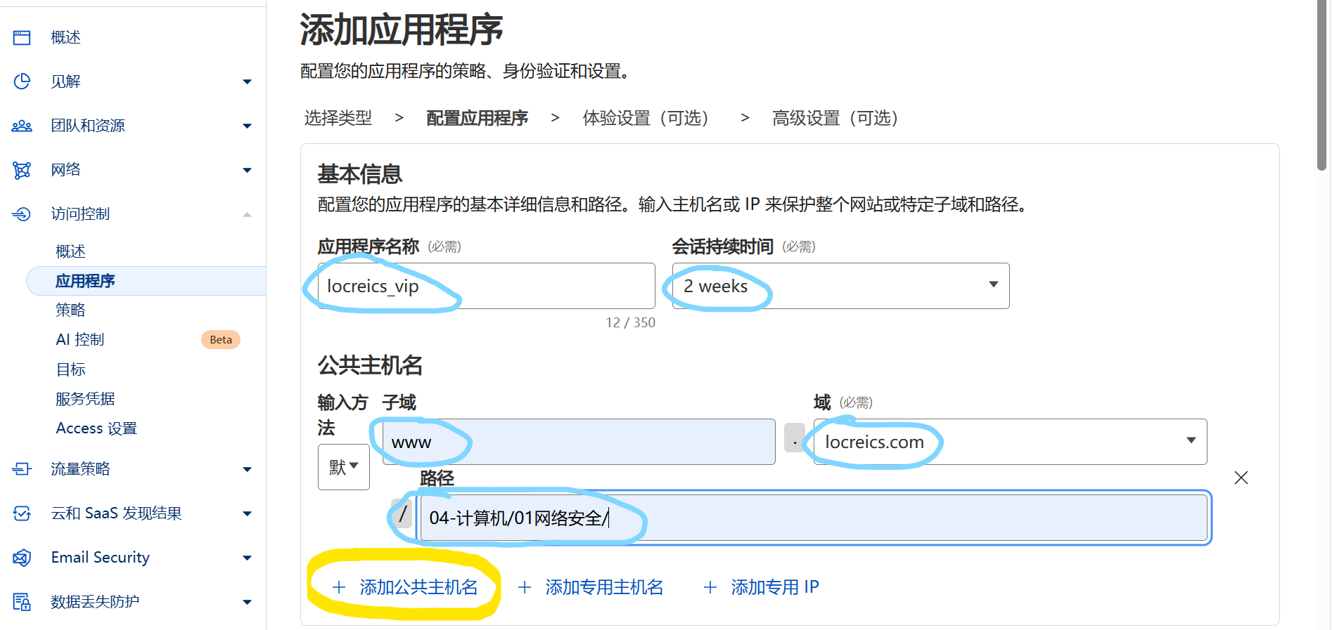 应用程序名自定义,绘话时长按需,再点击添加公共主机名,按需填写需要授权的部分,域名需要绑定在cloudflare上才可