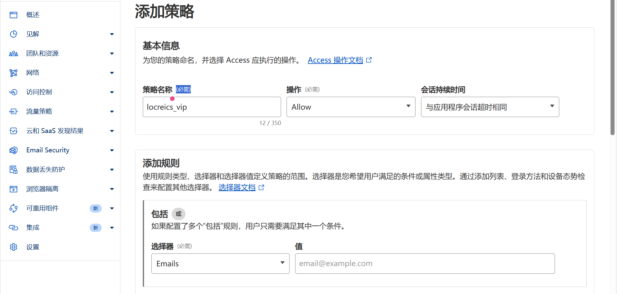 策略名可与后续规则程序名保持一致,操作为Allow,会话持续时间与应用程序相同,选择器可用emails,把自己需要授权的邮箱作为值填进